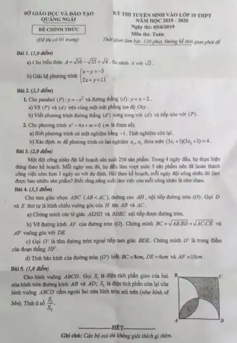 12.600 học sinh THCS ở Quảng Ngãi vừa hoàn thành xong phần thi môn Toán trong kỳ thi tuyển sinh vào lớp 10, trong đó nhiều thí sinh phát hiện đề thi có hai câu giống hệt với đề thi thử của Trường THCS Nguyễn Bá Loan (huyện Mộ Đức, Quảng Ngãi).
