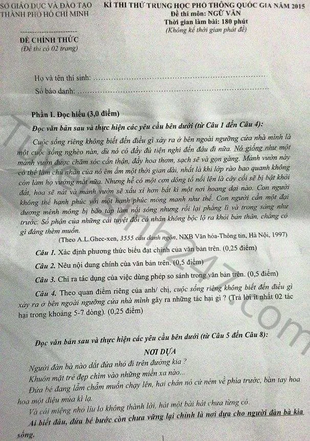 Đề thi, đáp án môn ngữ văn Kỳ thi thử THPT Quốc gia
