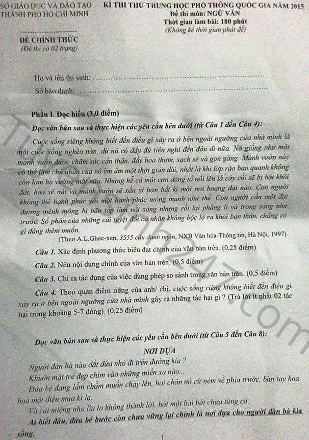 có thể xem đáp án môn ngữ văn Kỳ thi thử THPT Quốc gia
