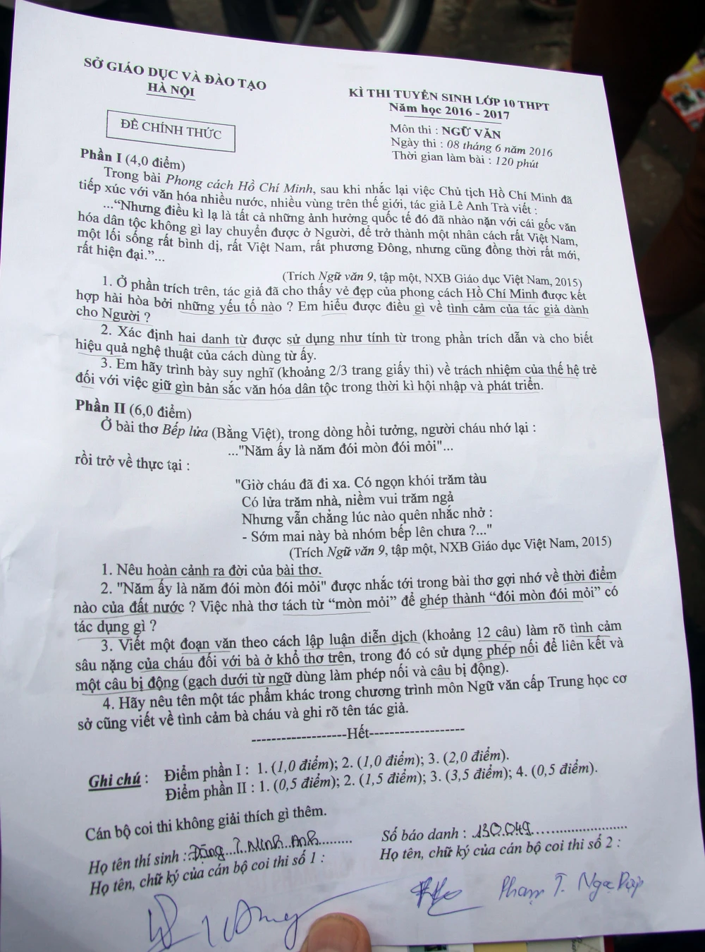 Đề thi môn Ngữ Văn sáng nay.