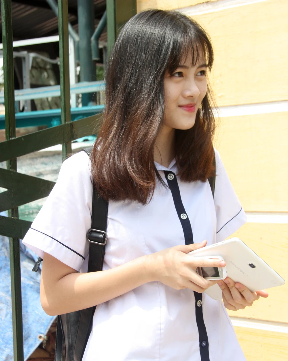 Hình ảnh một trong số thí sinh bước ra đầu tiên tại điểm thi của trường THPT Yên Hòa.