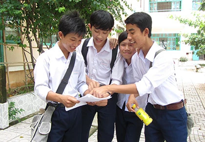 Sau buổi thi, HS tại Hội đồng thi Trường THPT Minh Đạm (huyện Long Điền, Bà Rịa-Vũng Tàu ) còn hào hứng tranh luận. Ảnh: HH