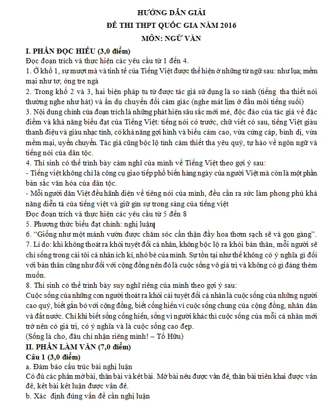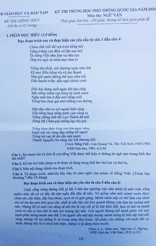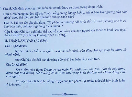 Đề thi môn Ngữ văn: