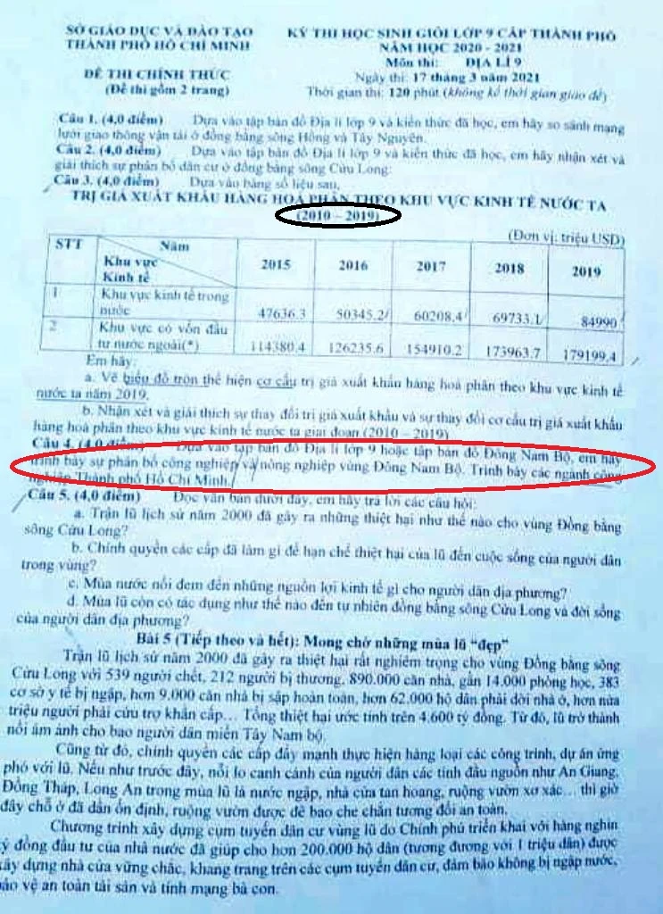 Cụ thể, đề thi lớp 12: "Dựa vào tập bản đồ Địa lí lớp 12 hoặc tập bản đồ Đông Nam Bộ, em hãy trình bày sự phân bố công nghiệp và nông nghiệp vùng Đông Nam Bộ. Trình bày các ngành công nghiệp TP.HCM". Còn đề thi lớp 9: "Dựa vào tập bản đồ Địa lí lớp 9 hoặc tập bản đồ Đông Nam Á, em hãy trình bày sự phân bố công nghiệp và nông nghiệp vùng Đông Nam Bộ. Trình bày các ngành công nghiệp TP.HCM".