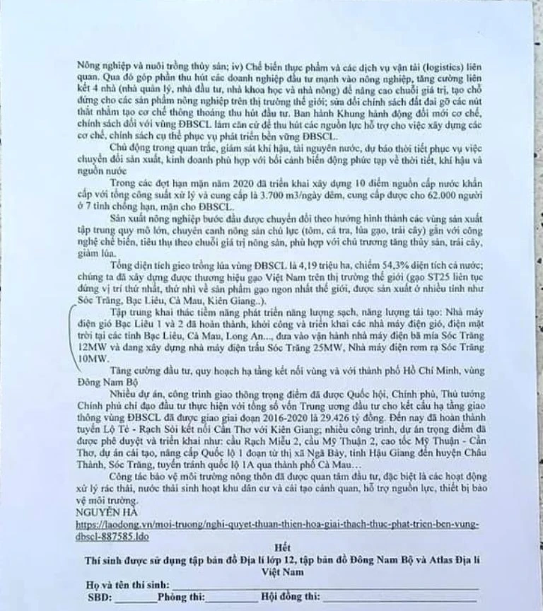 Đề thi học sinh giỏi môn Địa lí lớp 12. Ảnh: KH