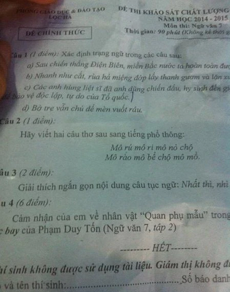 Những ngày qua, cộng đồng mạng và nhiều học sinh rất quan tâm đến đề thi môn Ngữ văn của học sinh lớp 7 huyện Lộc hà, tỉnh Hà tĩnh khi yêu cầu học sinh hãy viết hai câu thơ sau sang tiếng phổ thông: