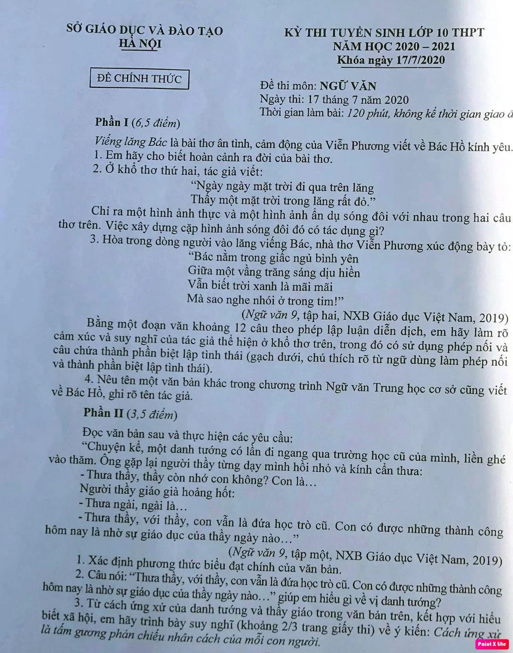 Đề thi Ngữ văn tại Hà Nội năm nay có 2 phần, bài thơ Viếng lăng Bác được chọn ở phần 1 với 4 câu hỏi, chiếm 6,5 điểm.