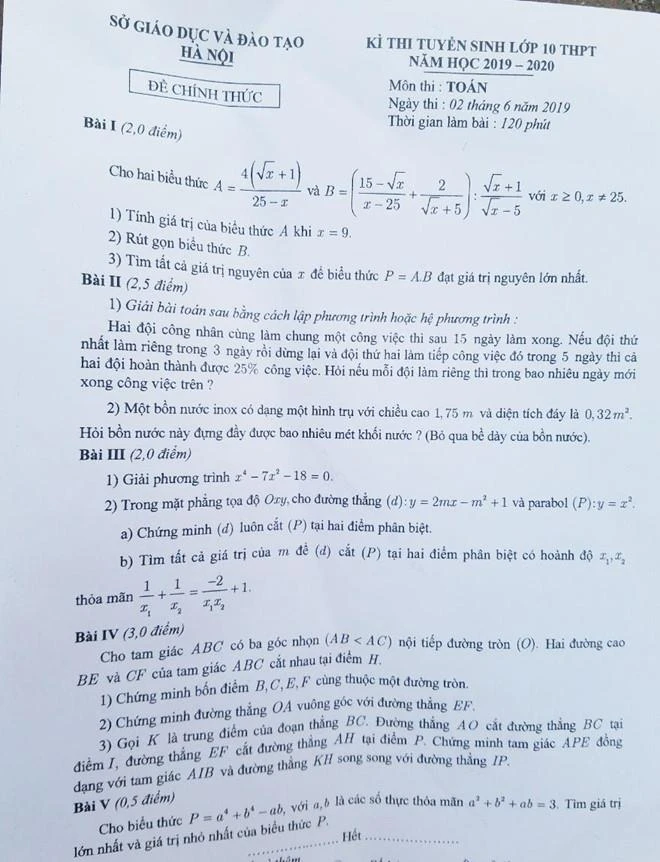 Đề Toán lớp 10 tại Hà Nội