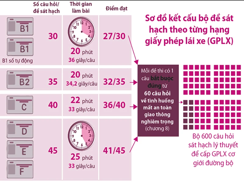 Sơ đồ kết cấu bộ đề sát hạch theo từng hạng giấy phép lái xe. Đồ họa: HỒ TRANG