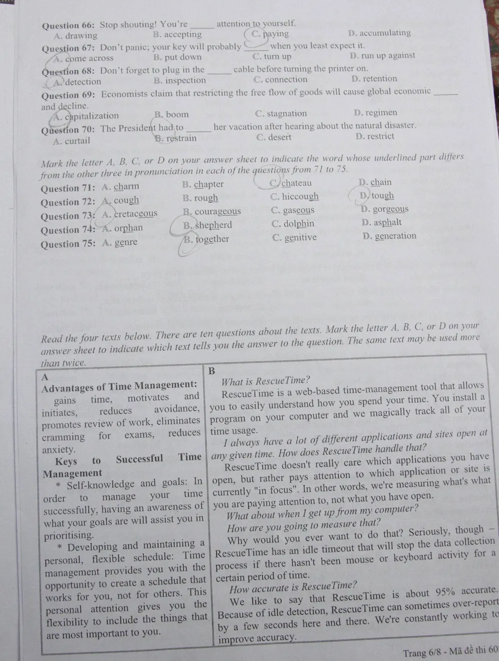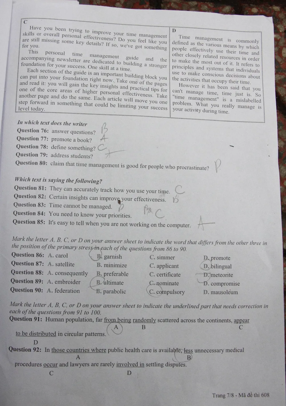 Thí sinh làm bài thi trong vòng 120 phút với 100 câu hỏi trắc nghiệm và hai đoạn văn tự luận.