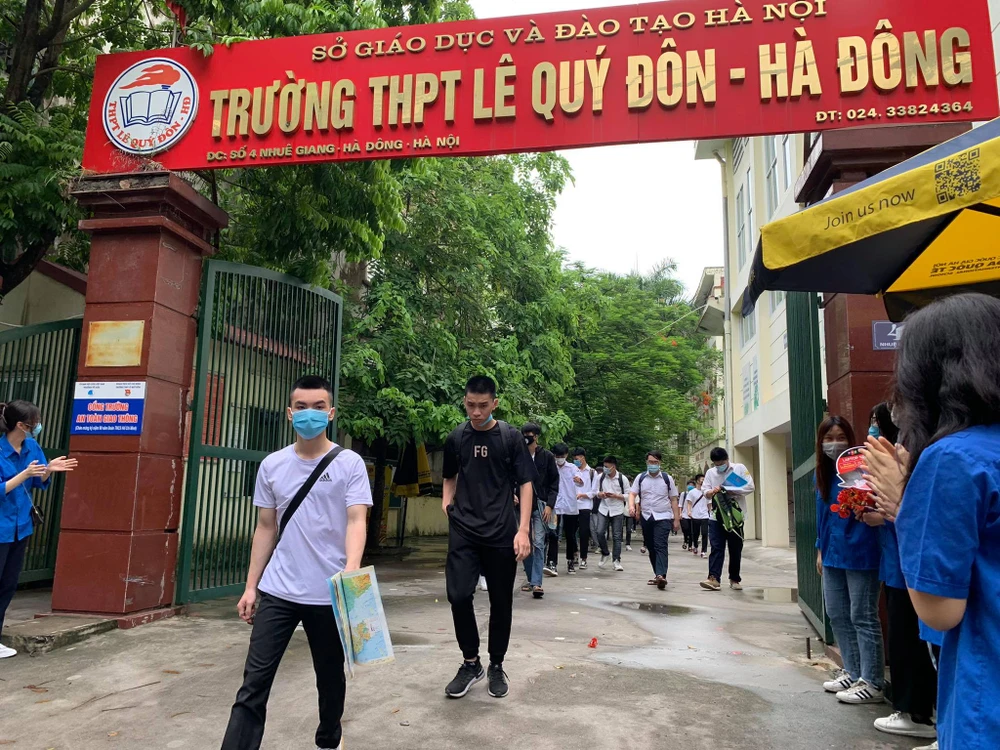 Những thí sinh đầu tiên bước ra khỏi phòng thi tại điểm thi trường THPT Lê Quý Đôn - Hà Nội. Ảnh: Hà Phượng