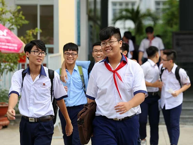 Thí sinh vui vẻ rời phòng thi môn văn tại điểm thi THCS Đống Đa, quận Bình Thạnh, TP.HCM. Ảnh: HOÀNG GIANG