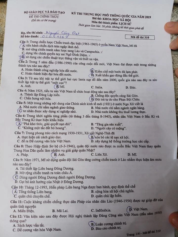 Tham khảo gợi ý làm bài môn Lịch sử, mã đề 315, mời xem TẠI ĐÂY