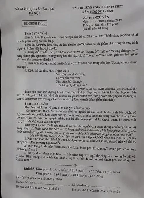 Đề bài gồm 2 phần, phần I yêu cầu thí sinh xác định thể loại, nêu cảm xúc, tâm trạng của nhà thơ và phân tích hiệu quả của phép tu từ trong bài thơ "Sang thu" của nhà thơ Hữu Thỉnh.
