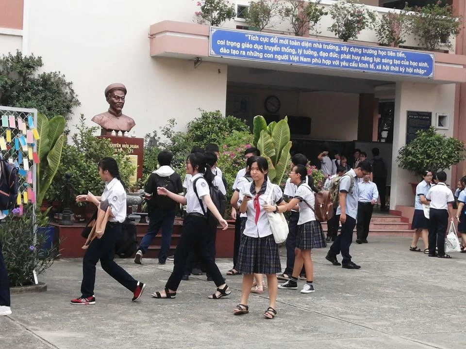 Các thí sinh sau giờ thi môn đầu tiên tại điểm thi Trường THPT Nguyễn Hữu Huân (quận Thủ Đức). Ảnh: TRẦN HẰNG