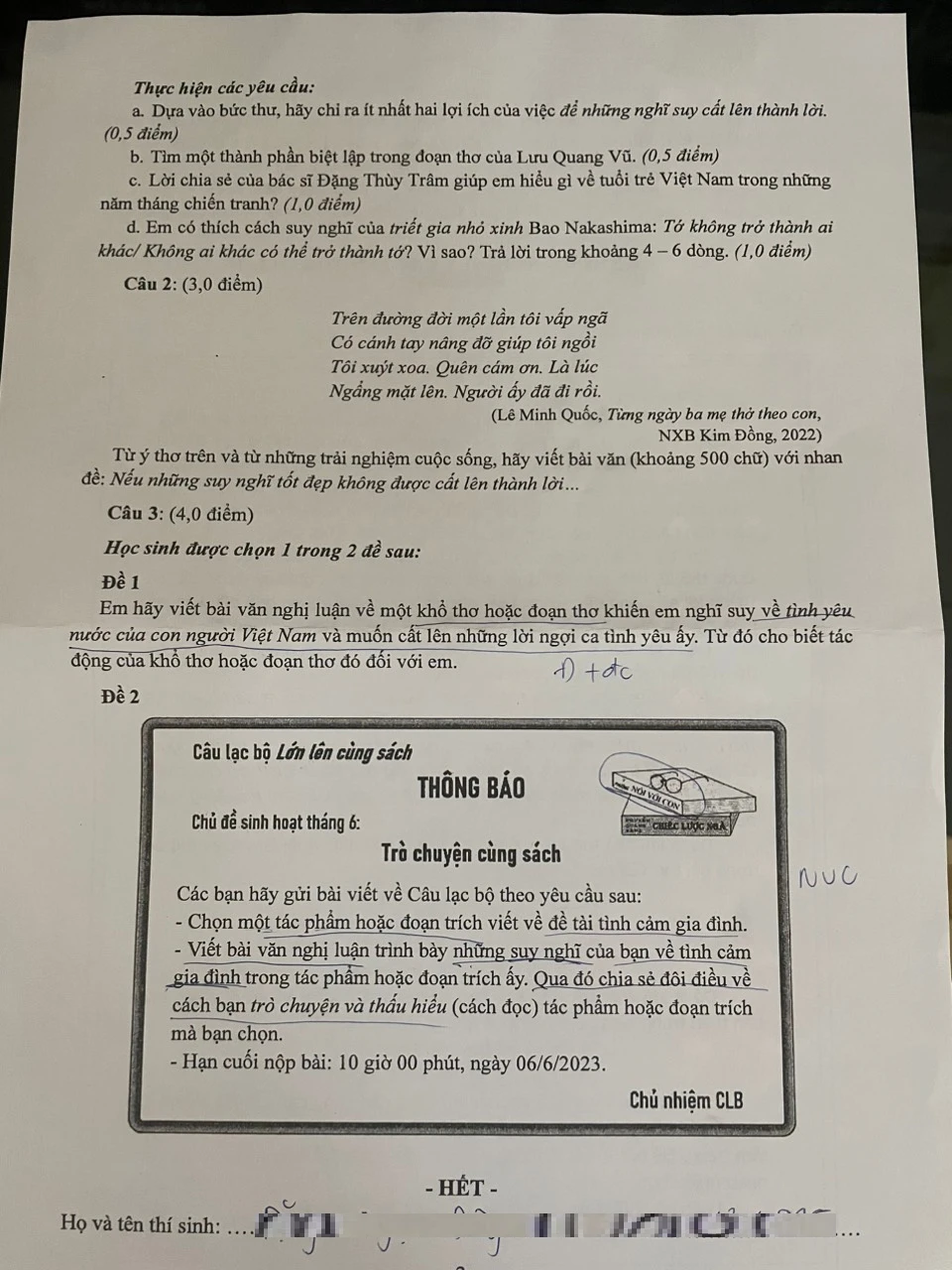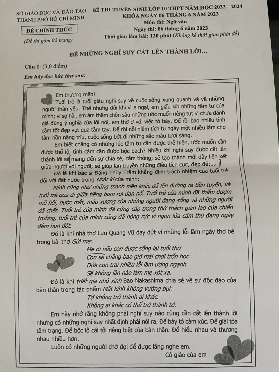 Đề thi văn vào lớp 10 tại TP.HCM: 'Để những nghĩ suy cất lên thành lời...'