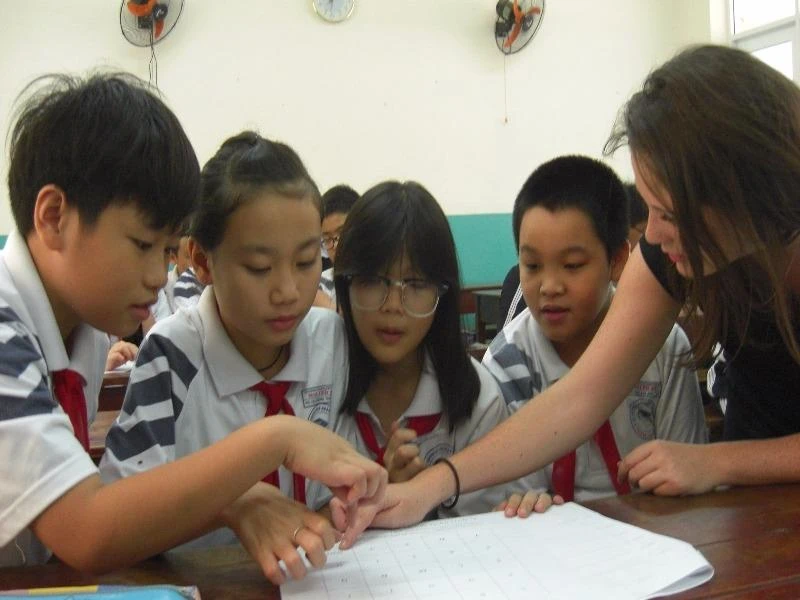 Học sinh đang học tiếng Anh với giáo viên bản ngữ tại một trường THCS ở TP.HCM. Ảnh: HÀ AN