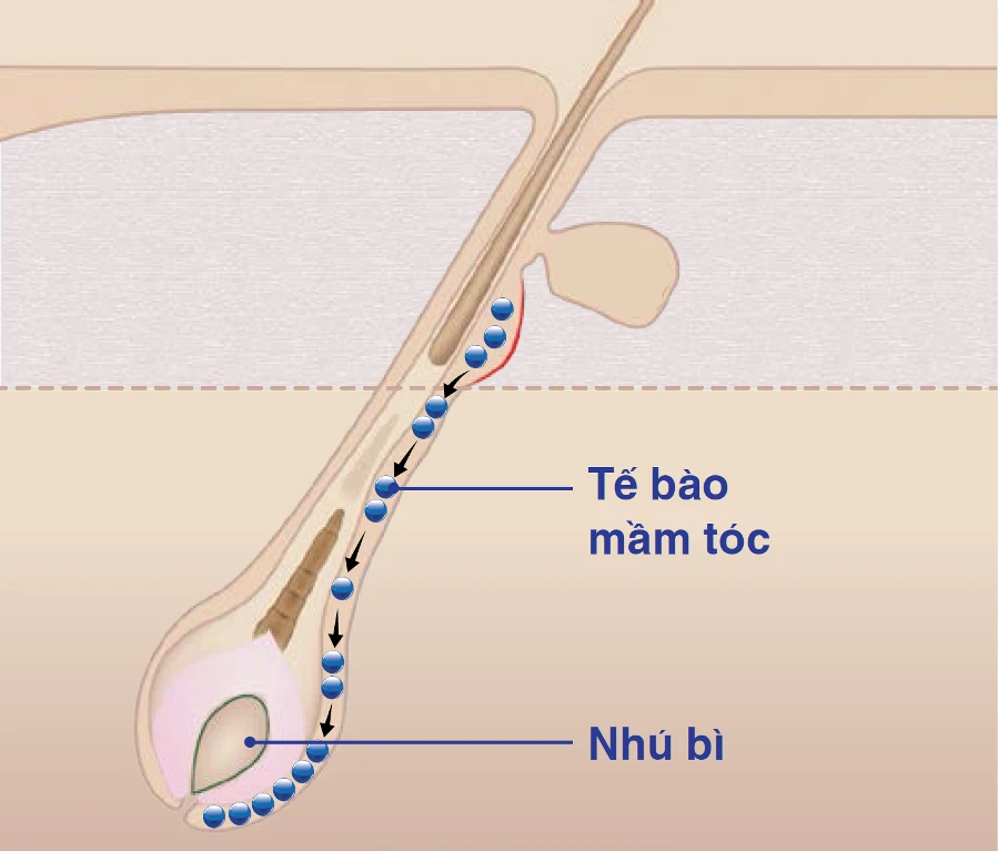 Tế bào mầm tóc di chuyển xuống nhú bì.