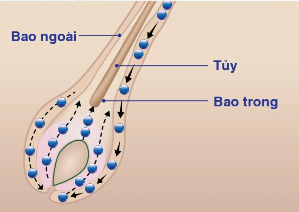 Phần “còn sống” là nang tóc. Trong nang tóc có một phần nhô ra gọi là phình tóc - nơi chứa các tế bào mầm tóc ban đầu. Khi quá trình mọc tóc mới diễn ra, thần kinh nội tiết sẽ truyền lệnh cho tế bào mầm tóc di chuyển xuống nhú bì, hấp thụ các chất dinh dưỡng phù hợp để biệt hóa thành các bộ phận của một sợi tóc hoàn chỉnh như tủy, bao trong, bao ngoài...