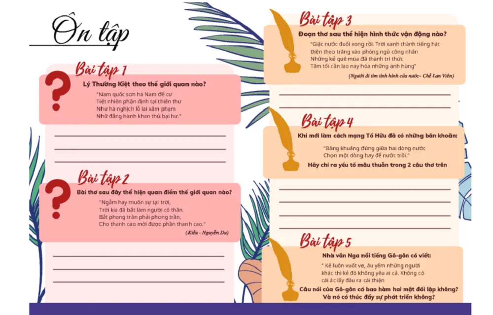 Ở phần bài tập, nhóm yêu cầu HS vận dụng kiến thức để tìm ra quan điểm Triết học trong những sự kiện lịch sử, tác phẩm văn học. Trong phần này, nhóm đã tham khảo đề cương bài tập GDCD của trường và chọn lọc ra những câu hay nhất.