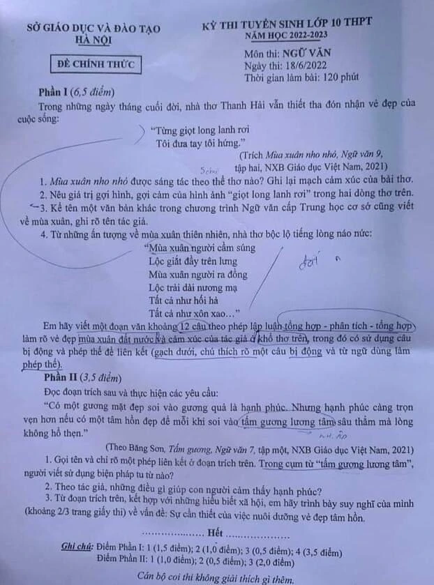 Được biết, sáng 18-6, gần 107 nghìn thí sinh thi lớp 10 của Hà Nội bắt đầu làm bài thi môn Ngữ văn của thi tuyển sinh vào lớp 10. |