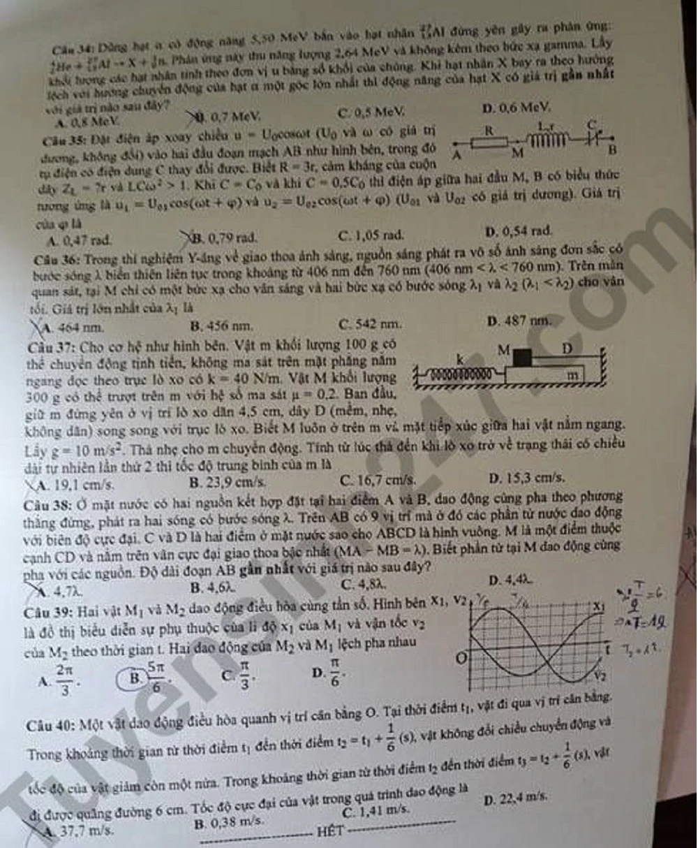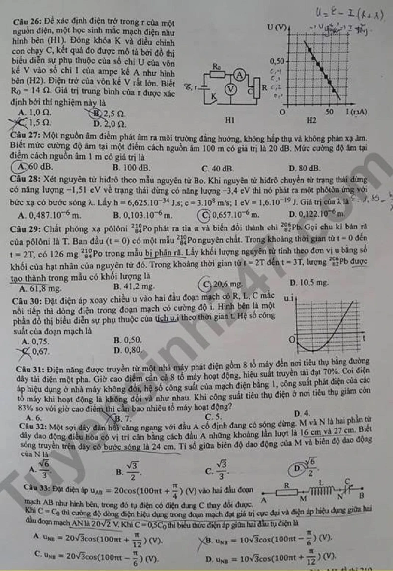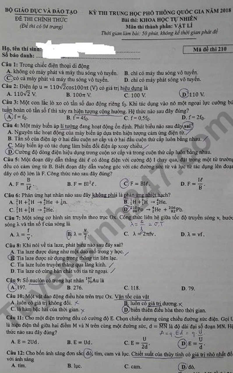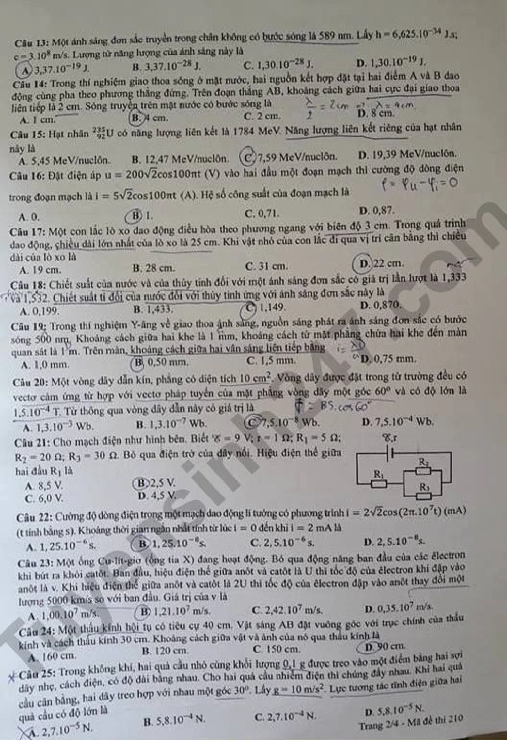 Đề thi Môn Vật lý, mã đề 210