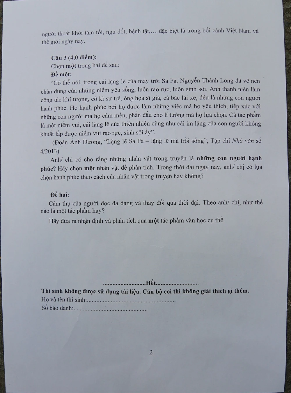 Thầy Bảo cho hay, trong đề thầy ấn tượng nhất là đề 1 của câu 3. Đề bài không khó, yêu cầu học sinh chọn nhận vật, phân tích để làm rõ vì sao họ là những con người hạnh phúc.