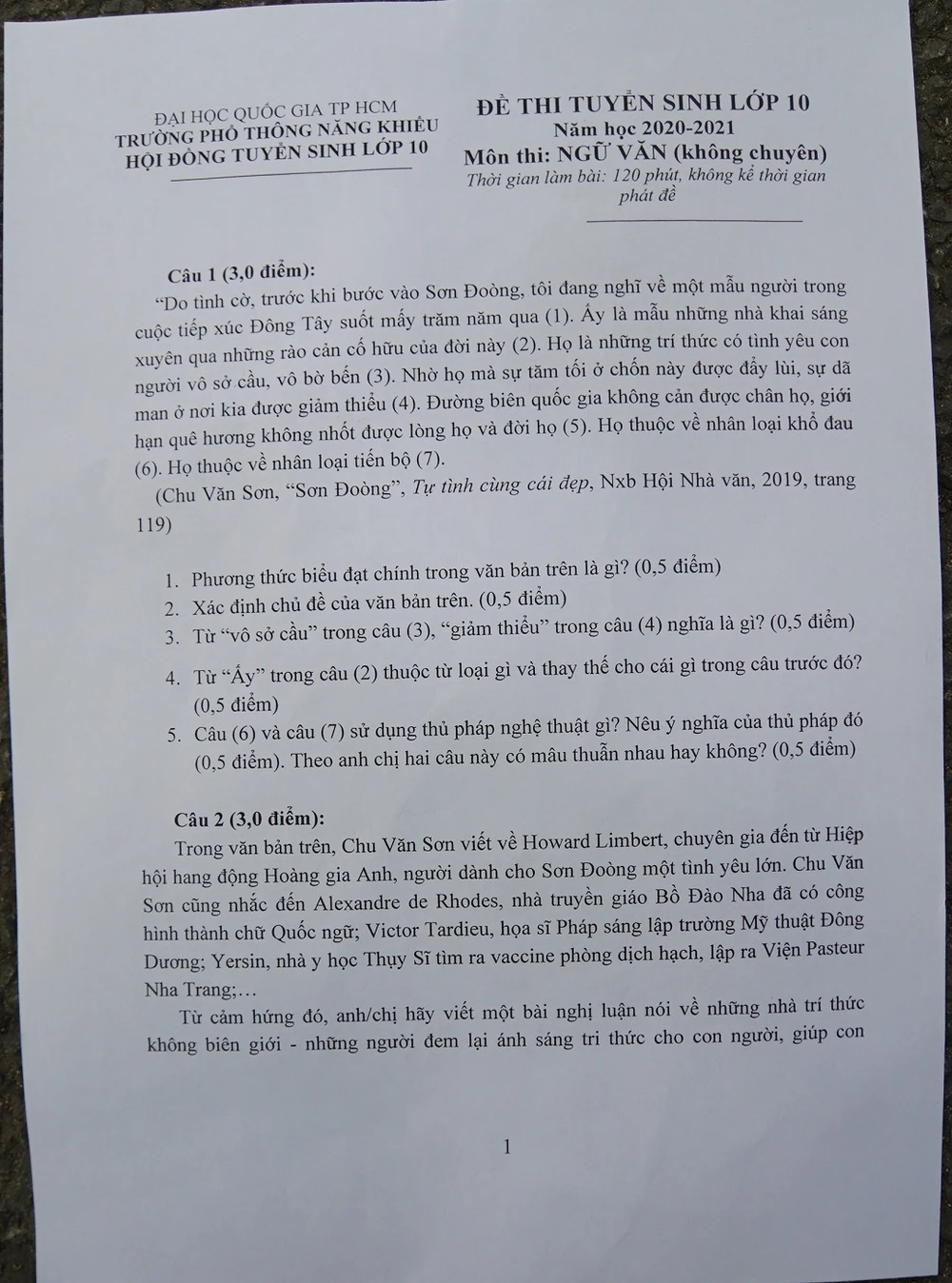 Đề văn không chuyên vào lớp 10 Phổ thông Năng khiếu