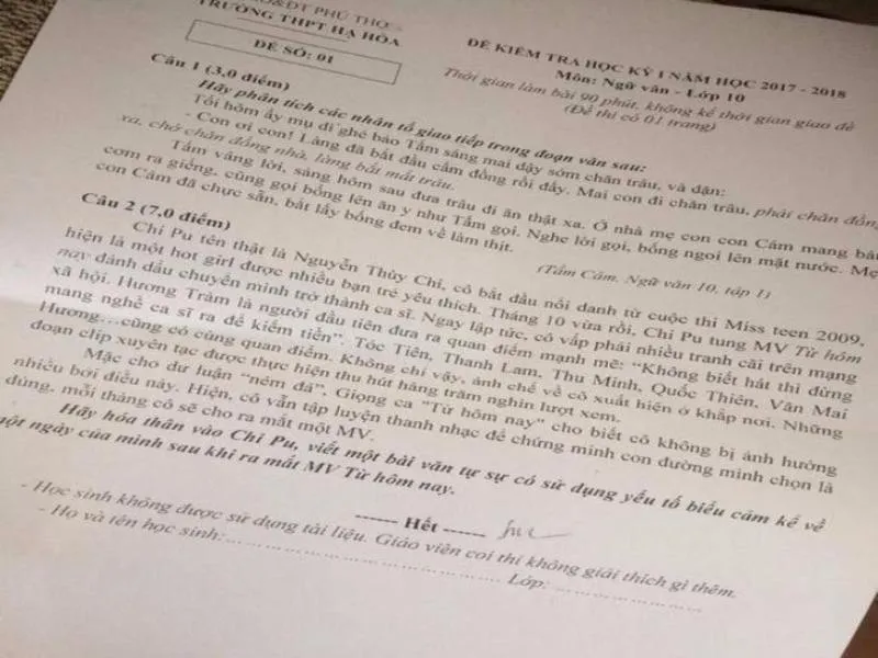 Vừa qua, trong đề kiểm tra học kỳ 1 môn ngữ văn của Trường THPT Hạ Hòa (Phú Thọ) có hai câu, ngoài một câu hỏi (3 điểm) về bài Tấm Cám, tổ chuyên môn trường này đưa ra một câu (7 điểm) liên quan đến ca sĩ Chi Pu khiến dư luận có nhiều tranh cãi.