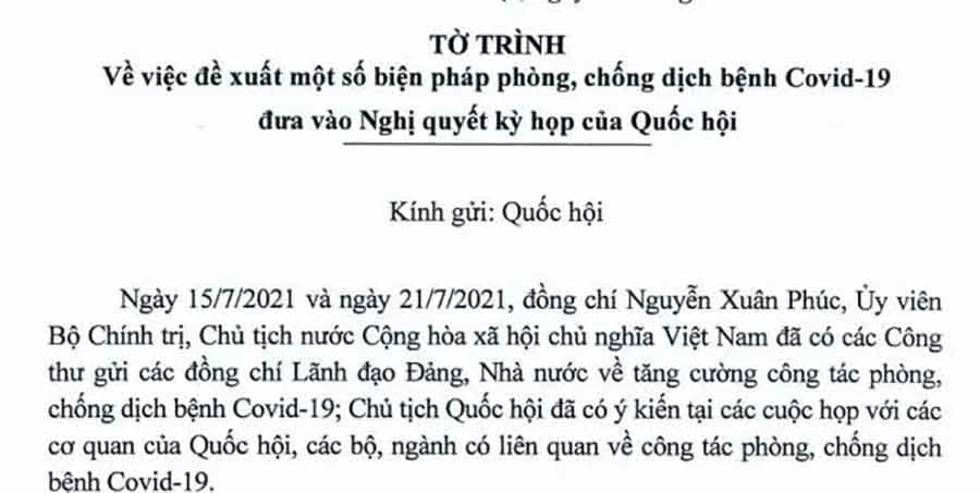 Ngày 24-7, Chính phủ đã trình Quốc hội đề xuất một số biện pháp phòng, chống dịch bệnh COVID-19 khi nội dung này được đưa vào Nghị quyết kỳ họp của Quốc hội.
