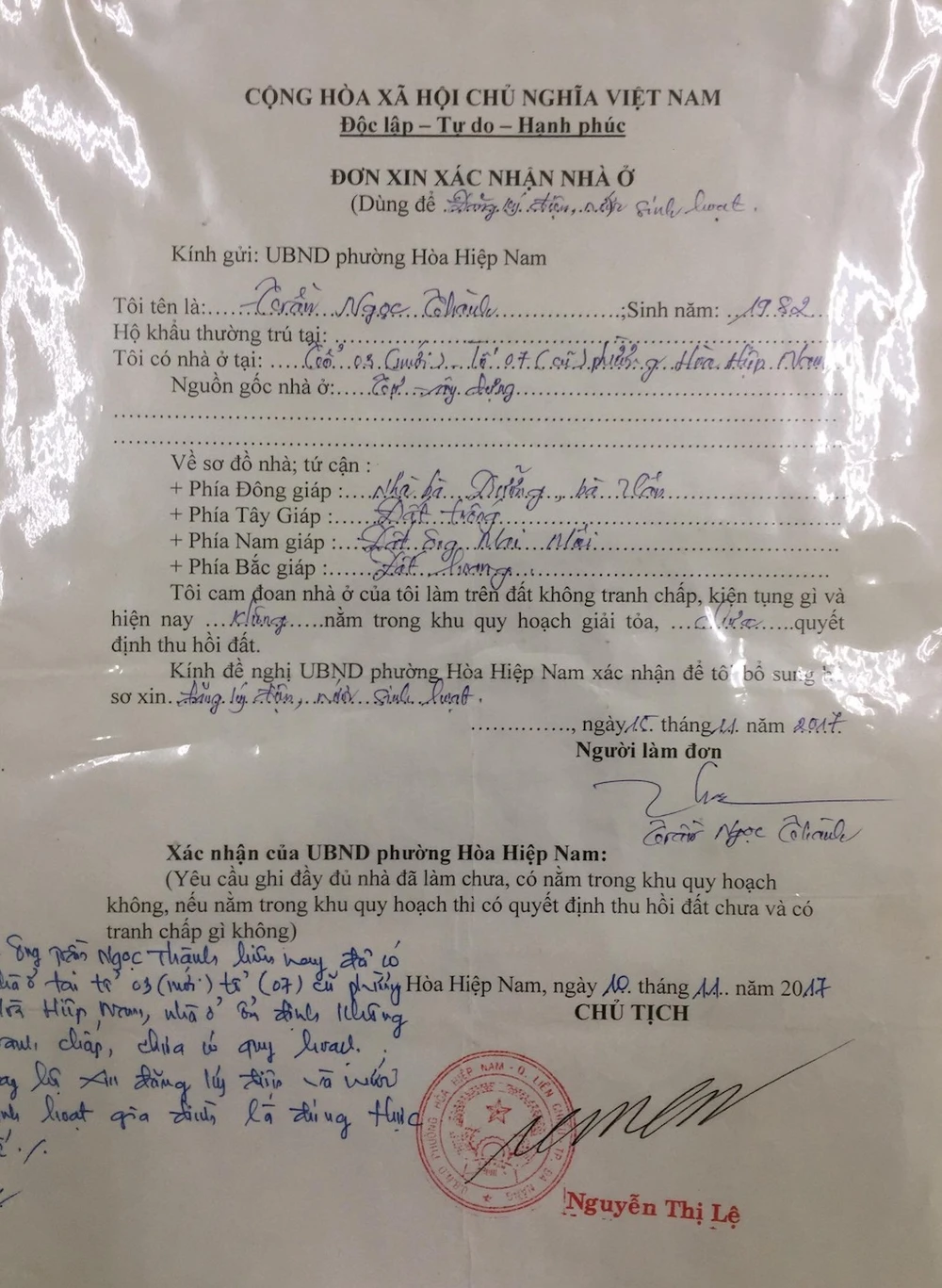 Trước đó, ông Nguyên làm “Đơn xin xác nhận nhà ở” cho ông Trần Ngọc Thành ở tổ 3 (phường Hòa Hiệp Nam). Ông Nguyên đã photocopy chữ ký của nữ chủ tịch phường này rồi dán lên đơn để hợp thức hóa.