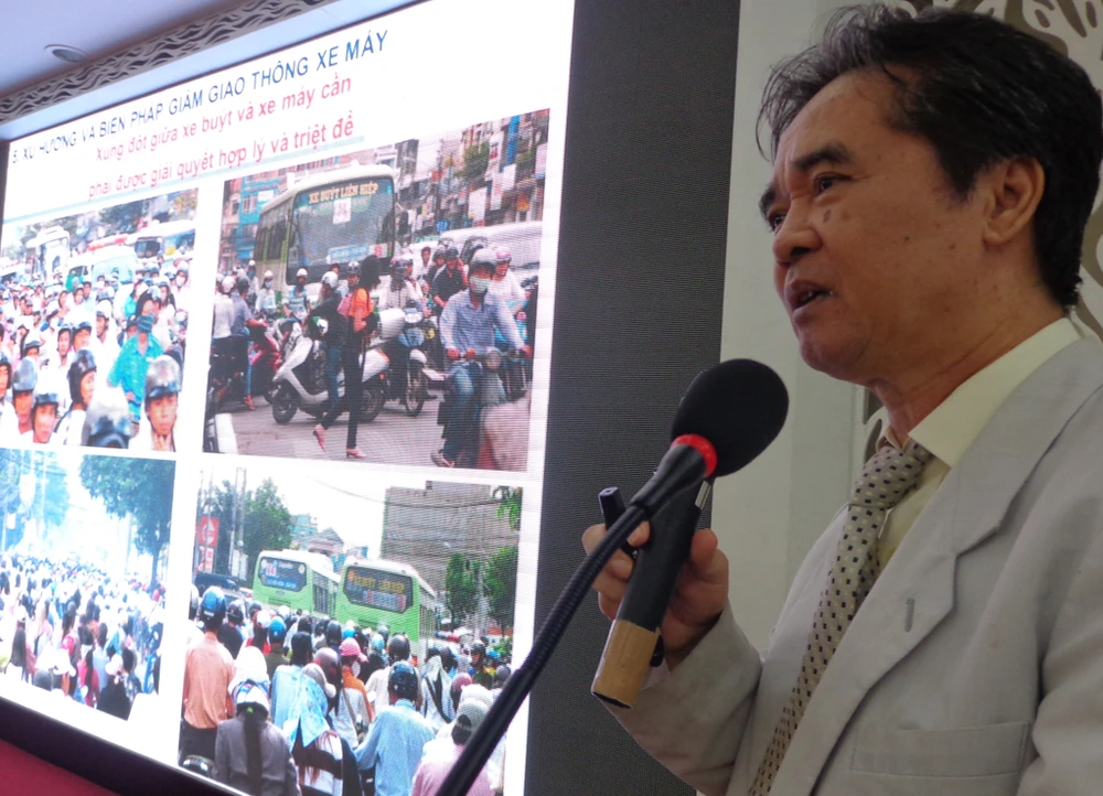 PGS-TS Phạm Xuân Mai nhấn mạnh xe máy là kẻ chiếm đường của TP, từ lòng lề tới vỉa hè của TP bị chiếm dụng tới 93% bởi xe máy. "Do đó, không nên xem xe máy là phương tiện giao thông nữa, cần loại bỏ nó ra khỏi "danh bộ" các loại xe được chạy trên đường. Chúng ta đừng nói bằng "mỹ từ" kiểm soát xe máy nữa mà phải nói thẳng là cấm. Cấm. Cấm hẳn. Đừng sợ!" - PGS-TS Phạm Xuân Mai nói.