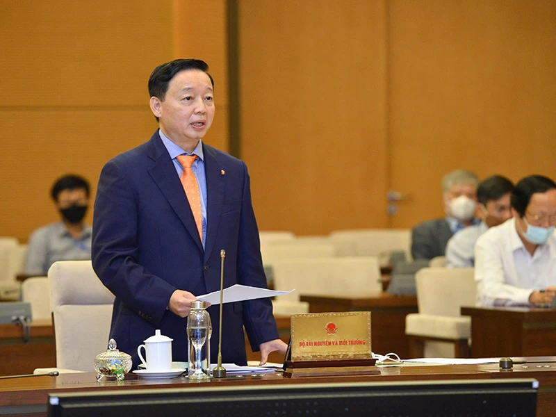 Bộ trưởng Bộ TN&MT Trần Hồng Hà trình bày tờ trình dự án luật. Ảnh: TTXVN