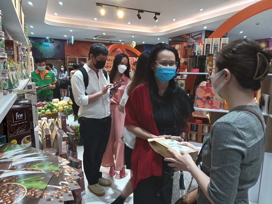 Các doanh nghiệp tìm kiếm đối tác tại Tuần lễ triển lãm sản phẩm lương thực thực phẩm 2021. ẢNH: TÚ UYÊN