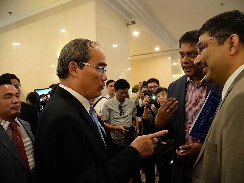 Bí thư Thành ủy TP.HCM Nguyễn Thiện Nhân trao đổi trực tiếp với các nhà đầu tư trong và ngoài nước tại một hội nghị xúc tiến đầu tư vào TP.HCM. Ảnh: Tá Lâm