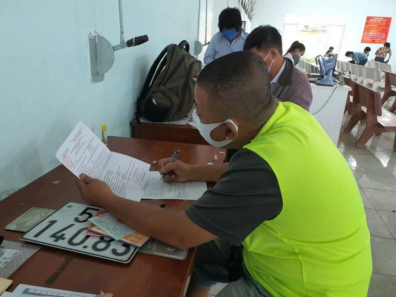Người dân kê khai hồ sơ chuyển đổi biển số xe tại cơ quan chức năng. Ảnh: THY NHUNG
