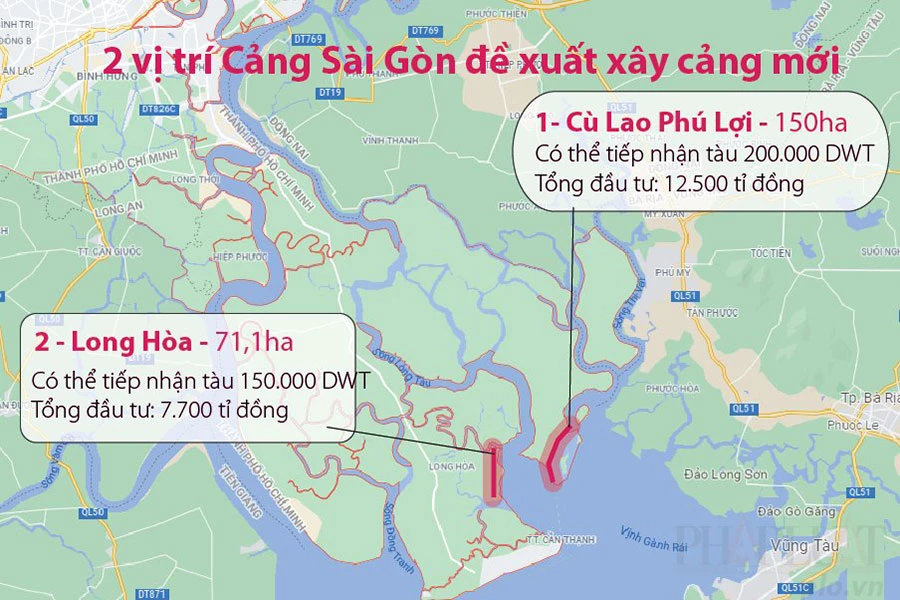 Vì vậy, Công ty Cảng Sài Gòn cùng với hãng tàu container MSC đã nghiên cứu và đề xuất triển khai dự án đầu tư bến cảng mới tại hai vị trí. Cụ thể, vị trí số một tiếp giáp luồng Cái Mép - Thị Vải, thuộc địa phận cù lao Phú Lợi, huyện Cần Giờ. Vị trí số hai tiếp giáp luồng Sài Gòn - Vũng Tàu, thuộc địa bàn xã Long Hòa, huyện Cần Giờ.