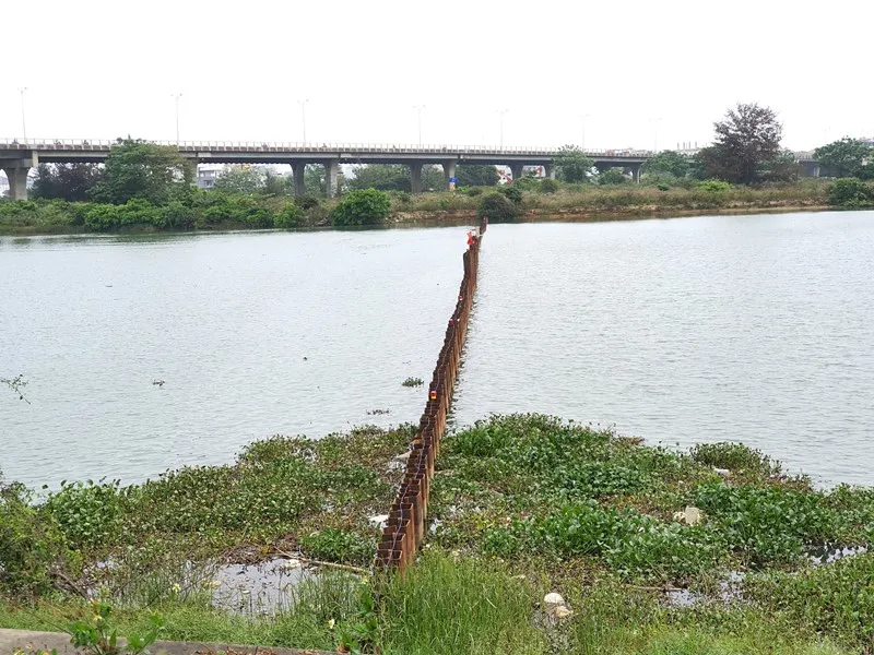 Đập tạm ngăn mặn bên dưới cầu Hòa Xuân. Ảnh: TẤN VIỆT