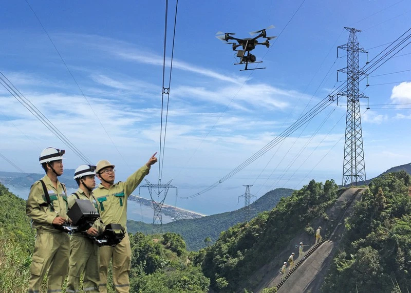 EVNNPT ứng dụng thiết bị bay UAV giám sát, phát hiện các sự cố trên lưới truyền tải điện. Ảnh: PLO