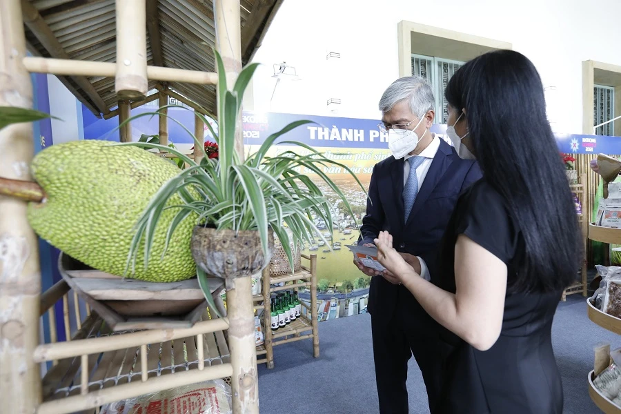 Lãnh đạo TP.HCM tham quan gian hàng của các tỉnh tại diễn đàn Mekong Connect 2021. ẢNH: T.QUỲNH