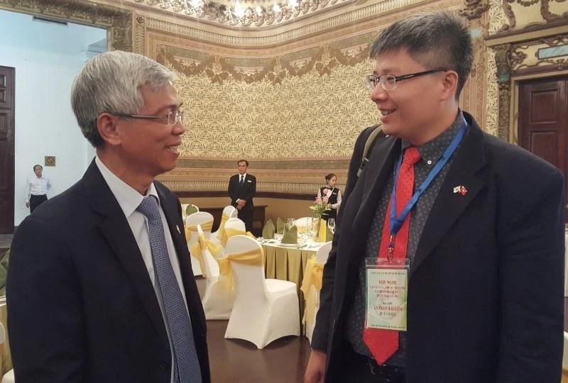 Giáo sư Trần Hải Linh trao đổi với ông Võ Văn Hoan, Chánh Văn phòng UBND TP.HCM bên lề hội nghị. Ảnh: TÁ LÂM
