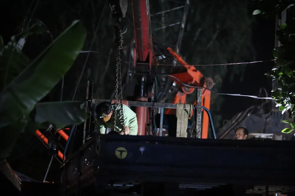 Lực lượng cứu hộ thận trọng khi khoan xung quanh cọc bê tông bởi địa chất khu vực này yếu, dễ sụt lún.