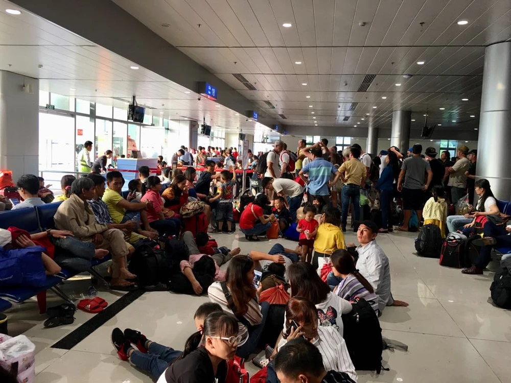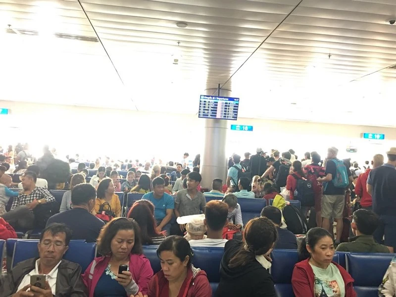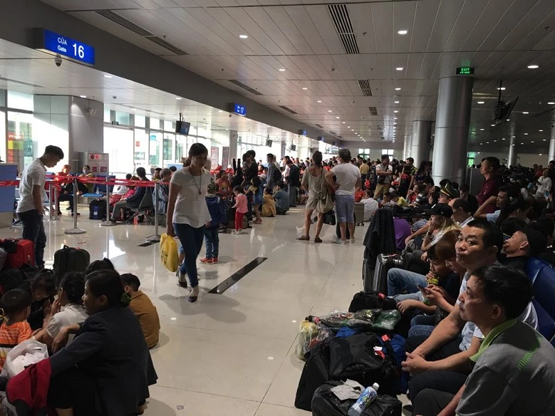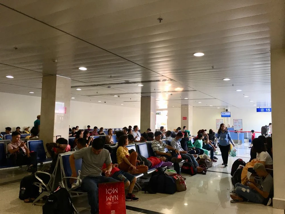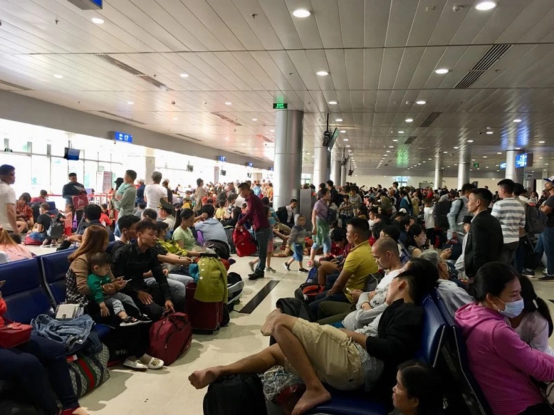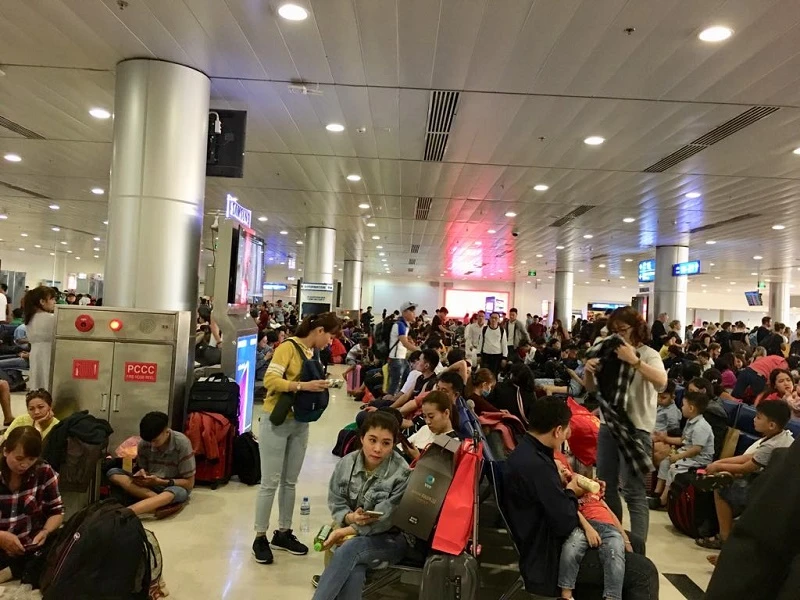 Tình trạng chuyến bay bị delay đã giảm, song lượng hành khách di chuyển trong đêm 30 Tết vẫn rất đông. Nhiều hành khách phải ngồi, ngủ dưới sảnh để chờ chuyến bay của mình.