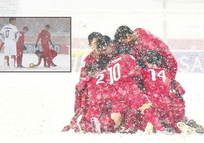 Phút 41 trận chung kết U-23 châu Á, tiền đạo Công Phượng bị một hậu vệ U-23 Uzbekistan phạm lỗi ngay trước vòng cấm địa, trong thời điểm đội tuyển U-23 Việt Nam bị dẫn bàn. Ngay lập tức, các tuyển thủ Văn Thanh, Xuân Trường, Đức Huy đứng gần chấm đá phạt cách cầu môn khoảng 20m bất ngờ cúi người xuống cào đống tuyết trắng xóa trên sân bóng Thường Châu. Từ chấm đá phạt trực tiếp, Quang Hải sút quả bóng lượn qua hàng rào đối phương làm tung lưới thủ môn Uzbekistan.