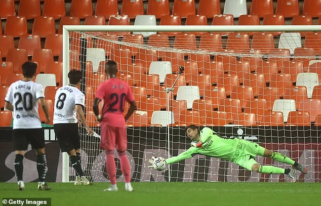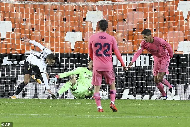 Phút 43, thủ môn Courtois và Varane phối hợp với nhau lúng túng để bóng trôi qua vạch vôi. Sau khi công nghệ VAR vào cuộc, trọng tài đã công nhận bàn thắng giúp Valencia vượt lên dẫn 2-1 sau giờ nghỉ giữa hai hiệp.