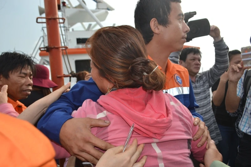 Những ngư dân bị nạn bước lên từ tàu cứu nạn.