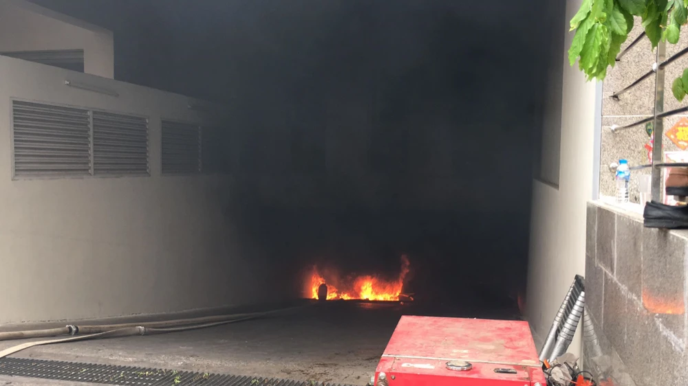 Vụ cháy xảy ra tại khu tầng hầm để xe có diện tích 1.000m2, số xe máy bị cháy là 150 xe, tô 13 xe và cháy rụi hoàn toàn 5 xe. Ảnh: N.TÂN