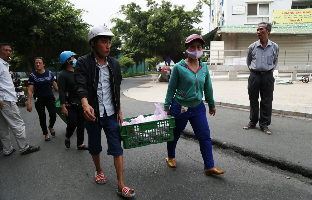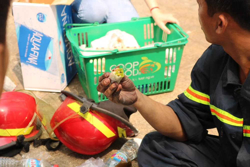Cơm và nước uống miễn phí được các cán bộ, nhân viên Trung tâm Công tác xã hội Thanh niên TP.HCM, nhân viên của Co.op Food ở khu chung cư Carina - nơi xảy ra vụ cháy kinh hoàng từ khuya qua, đi phát cho từng người dân.
