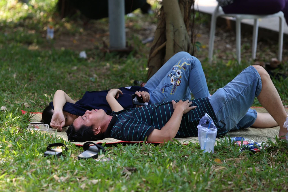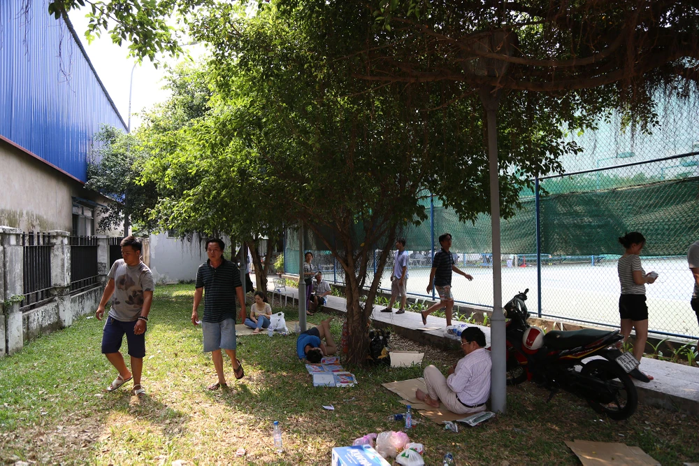 Nhiều người vật vờ ngủ dưới gốc cây bên ngoài chung cư bị cháy từ đêm đến giờ vẫn chưa hết bàng hoàng.