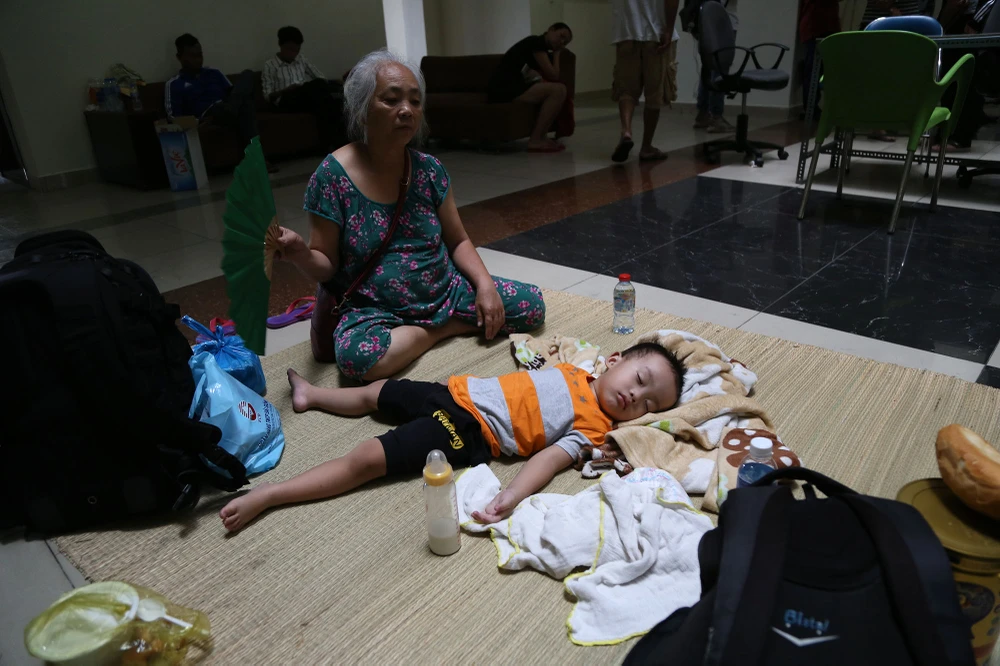 Người dân trải chiếu ngủ tạm ở tầng trệt block C chờ đăng ký hỗ trợ chỗ ở.